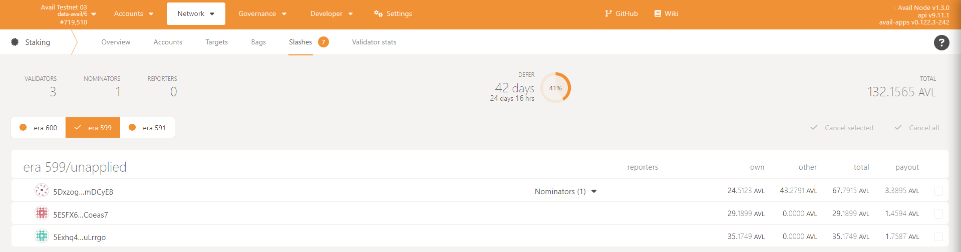 Nominators have the opportunity to renominate a slashed validator through a display row available in Avail Apps in the “Account Actions”.