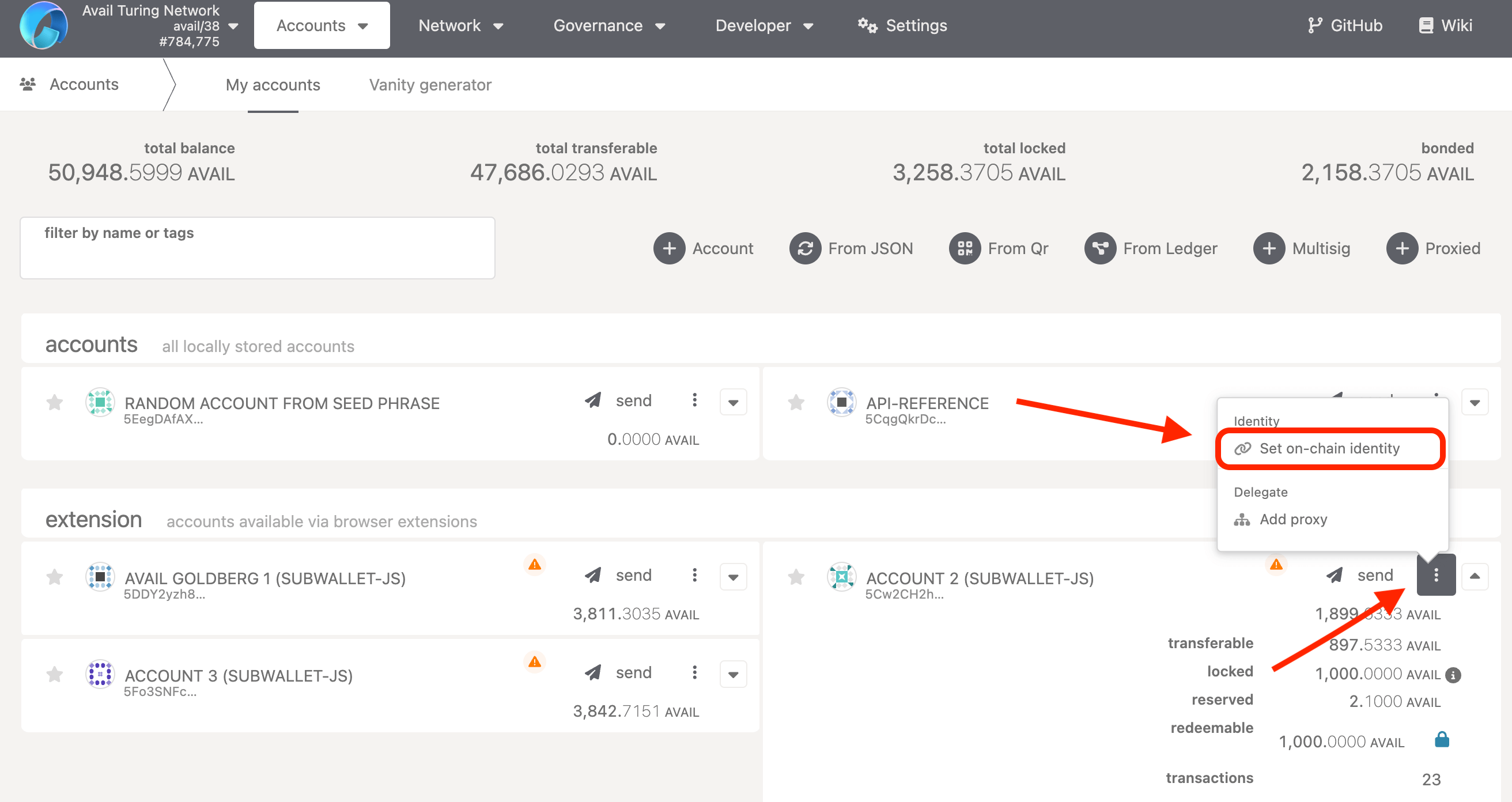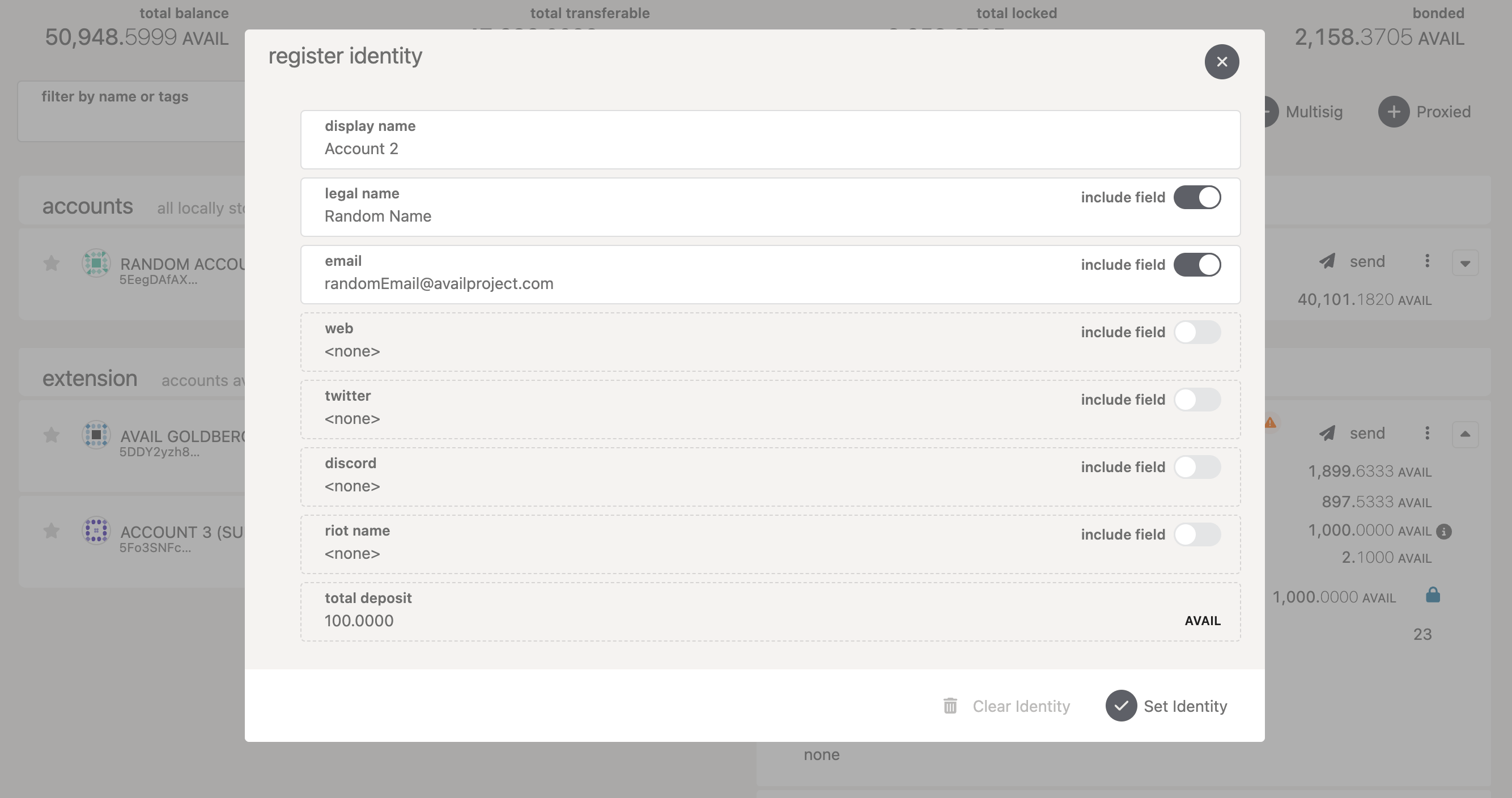 The account will now have a registered on-chain identity which you can clear to recover the bonded AVAIL tokens.
